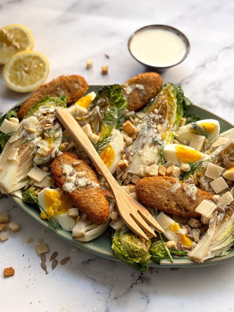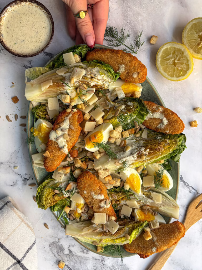 - Stel de salade samen: leg de gegrilde sla op een schaal, verdeel de dressing, ei, vega kip, croutons, Parmezaanse kaas en verse dille erover.