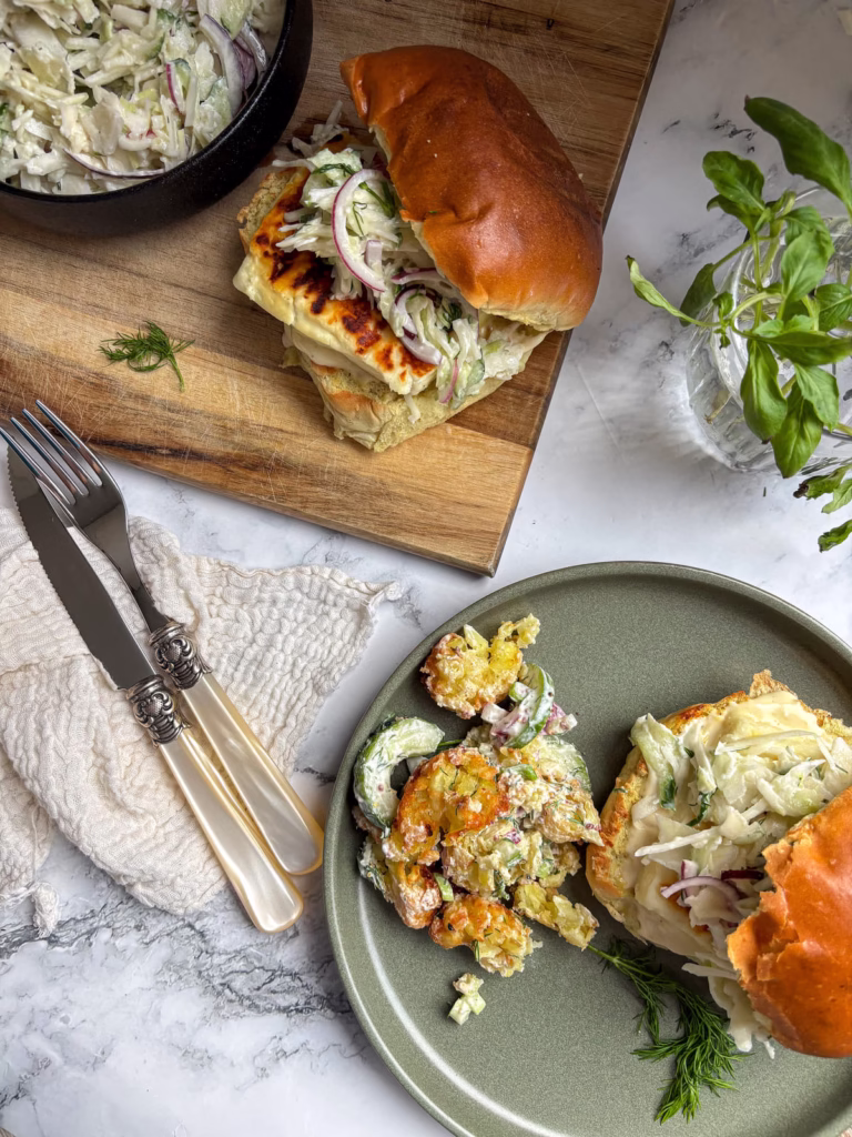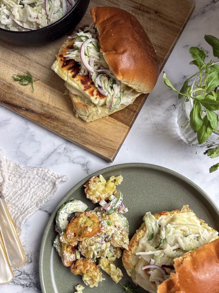 Het geheim van deze burger zit ‘m in de balans. De halloumi wordt krokant gebakken en behoudt z’n stevige bite, terwijl de koolsla fris en romig is door de smaken van tzatziki. Voeg daar een geroosterd broodje aan toe (liefst brioche of Turks brood) en je hebt een heerlijke vegetarische hamburger die ook perfect is van de barbecue. De tzatziki koolsla brengen we op smaak met dille en we maken een heerlijke citroenmayo voor extra frisheid.Voeg wat sla of rucola, eventueel gegrilde paprika of avocado toe, en je hebt een vega burger waar zelfs vleesliefhebbers stil van worden. Bonuspunten: hij zit bomvol smaak, maar voelt toch heerlijk licht en zomers.