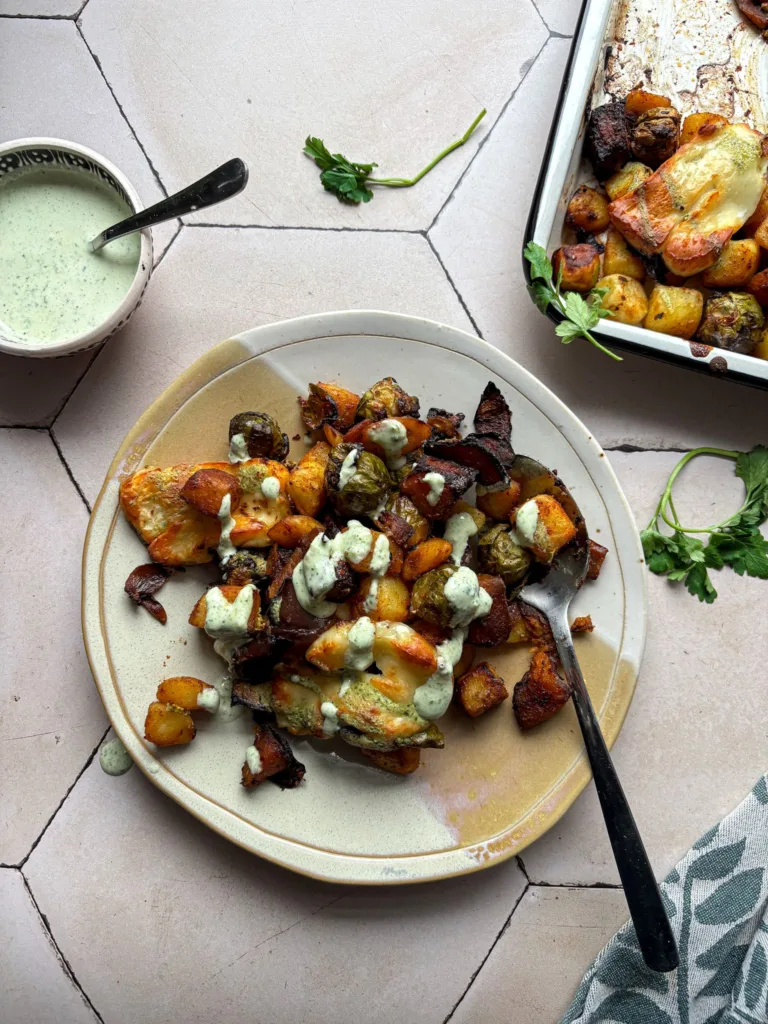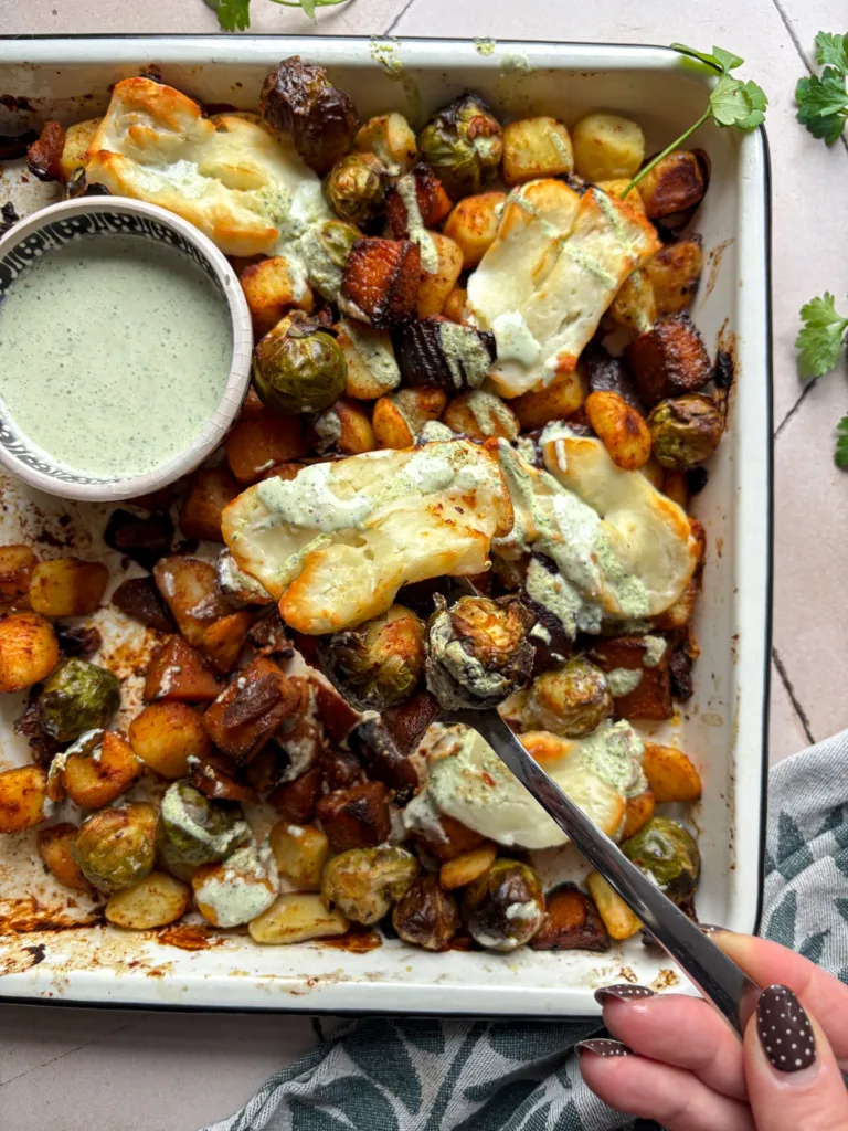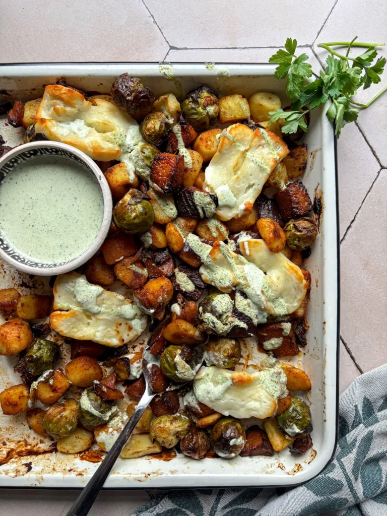 De romige yoghurtsaus met peterselie, koriander, citroen en een beetje knoflook tilt het gerecht naar een hoger niveau. Het frisse sausje contrasteert perfect met de warme, kruidige halloumi traybake. Je kunt hem eroverheen scheppen of ernaast serveren. Dit is echt zo’n gerecht waar je niet te veel aan hoeft te doen, maar dat toch super smaakvol is – ideaal voor een doordeweekse avond of een gezellig diner met vrienden.