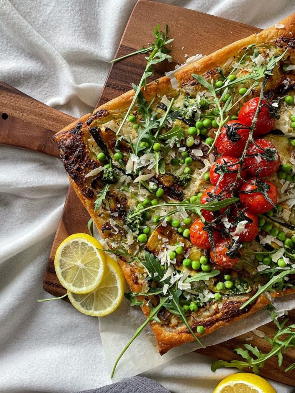 Plaattaart met groene groenten en pesto
