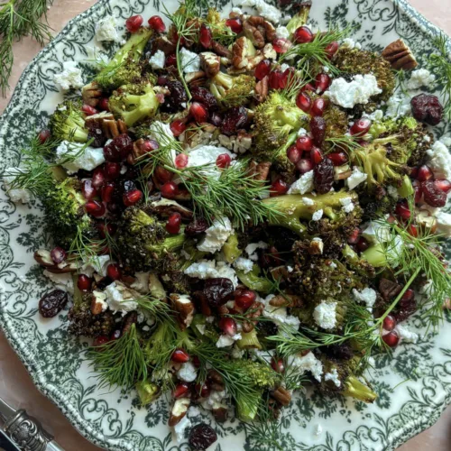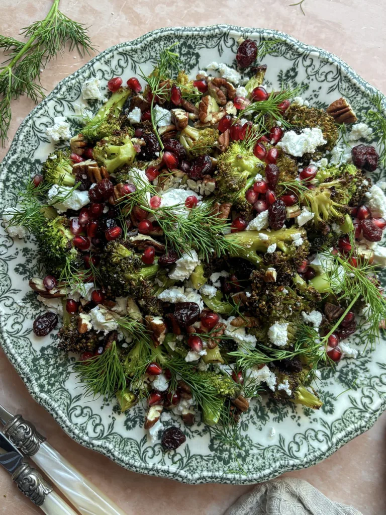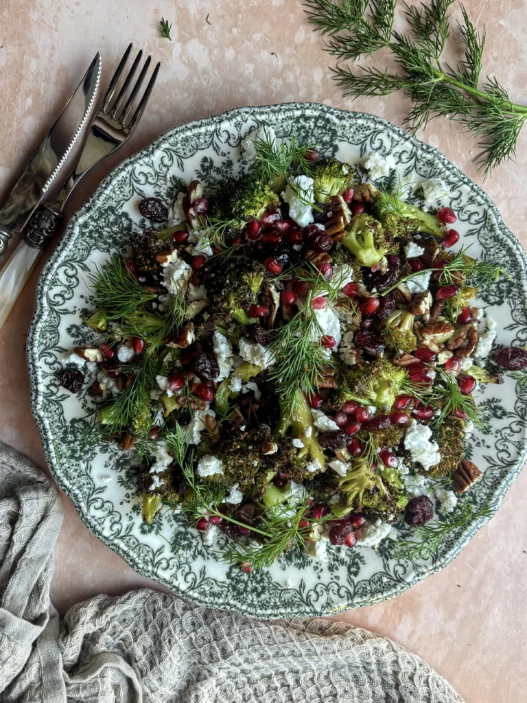 - Verdeel de geroosterde broccoli over een mooi bord. Hak de pecannoten fijn en verdeel samen met de cranberries, granaatappel, takjes dille en verkruimelde feta over het bord.