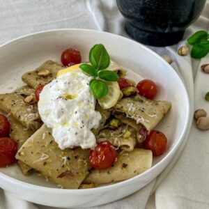 - Garneer de pasta met de burrata en eventueel nog wat extra pistachenootjes en parmezaanse kaas.