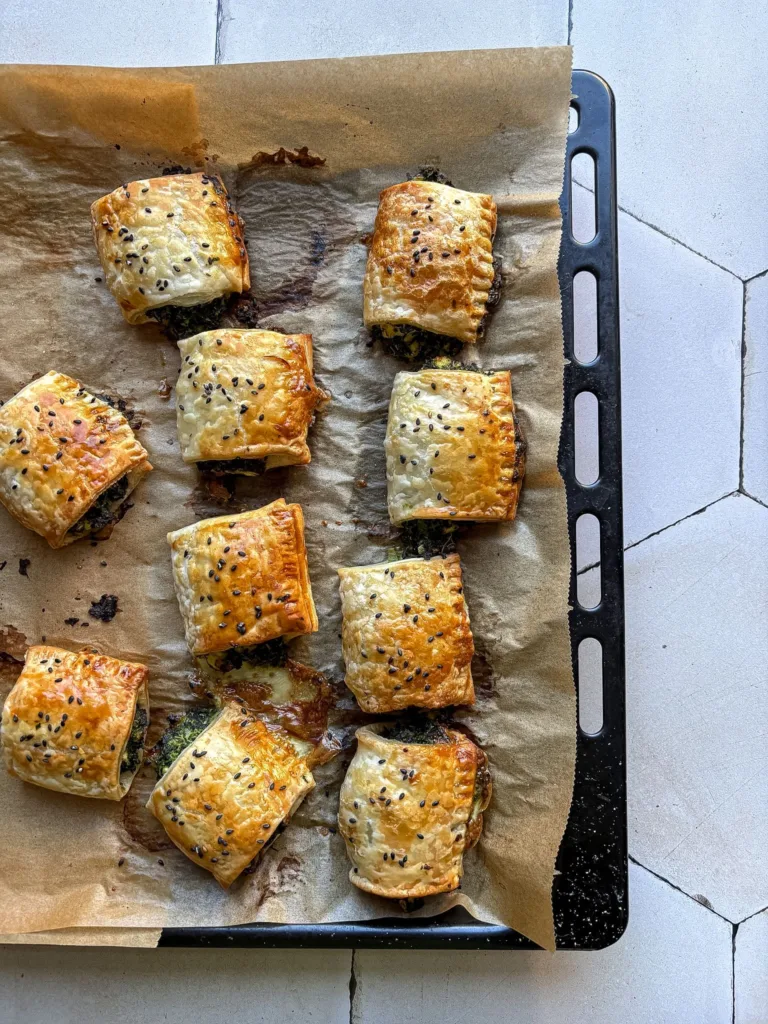 Bladerdeeghapjes met spinazie en feta uit de oven