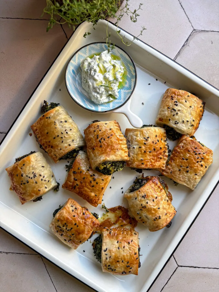 Wat deze bladerdeeghapjes zo fijn maakt, is dat je ze makkelijk van tevoren kunt maken. Even vullen, dichtvouwen en de oven doet de rest. Door ze te bestrijken met ei en te bestrooien met sesamzaadjes krijgen ze een mooie glans en een lichte crunch bovenop. Serveer ze direct uit de oven of laat ze iets afkoelen voor een borrelplank. Extra lekker in combinatie met zelfgemaakte tzatziki. En eerlijk: bij één hapje blijft het meestal niet… Voor je het weet is de hele schaal leeg!