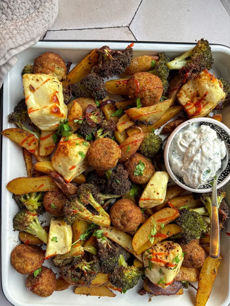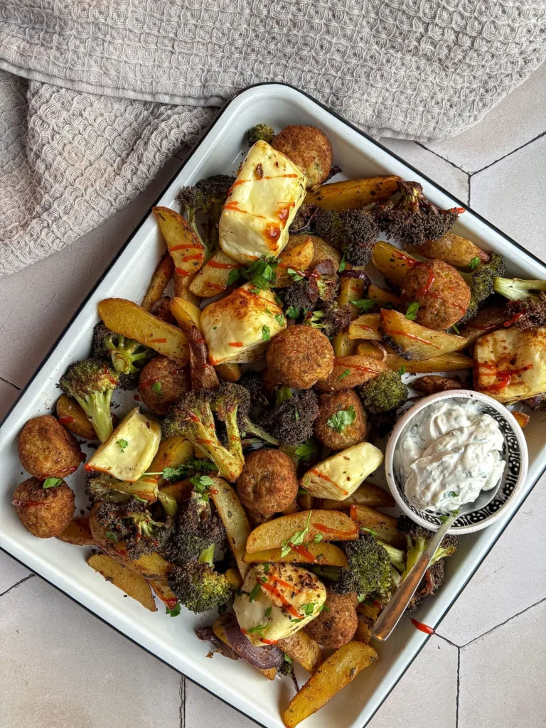 Traybake recept met falafel en halloumi