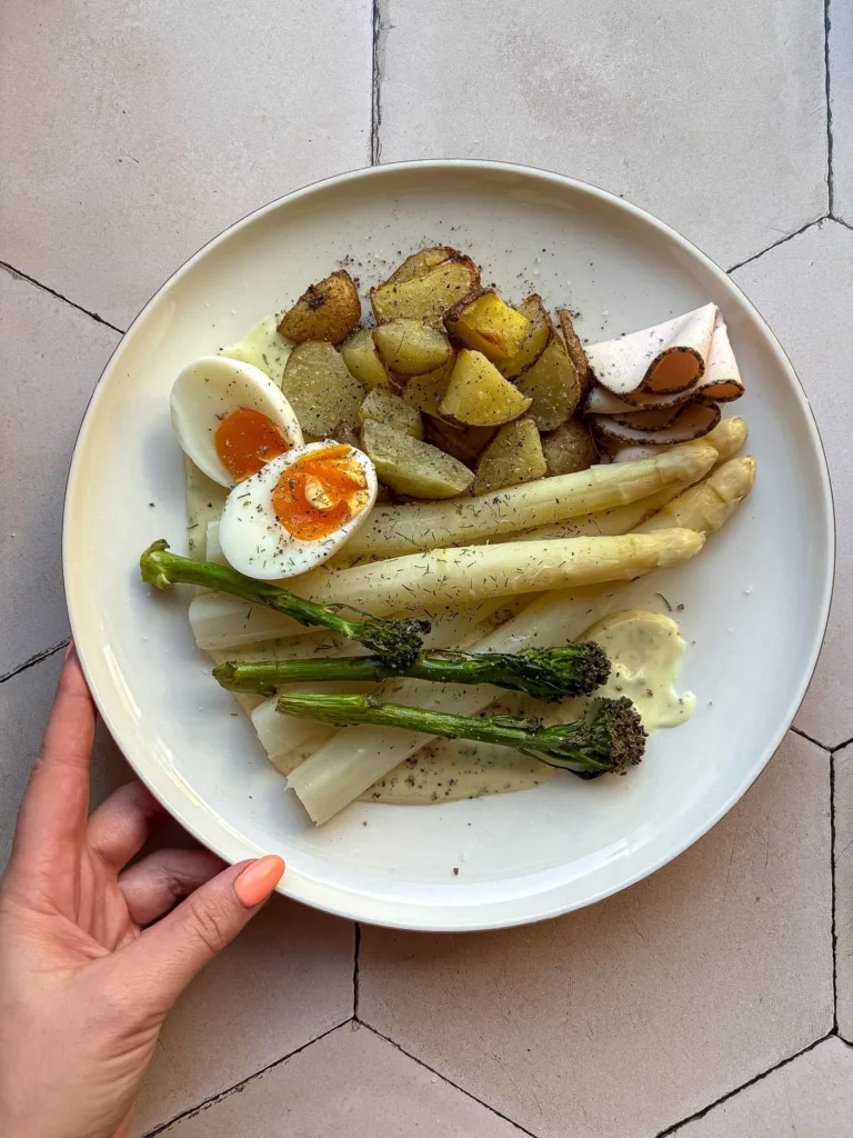 Het aspergeseizoen vraagt soms gewoon om klassiekers. Deze vegetarische asperges op klassieke wijze hebben alles wat je verwacht: zachte witte asperges, romige hollandaisesaus, krieltjes en ei. Alleen dan net even anders, met vegetarische hamplakjes, gegrilde bimi en een frisse touch van dille. Zo’n bord waar je rustig voor gaat zitten en waar eigenlijk niks meer aan hoeft te gebeuren. Oogt simpel, smaakt verrukkelijk!