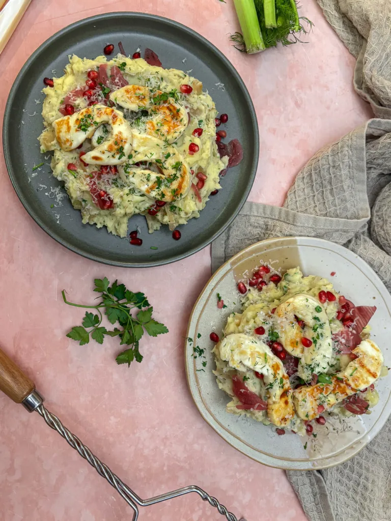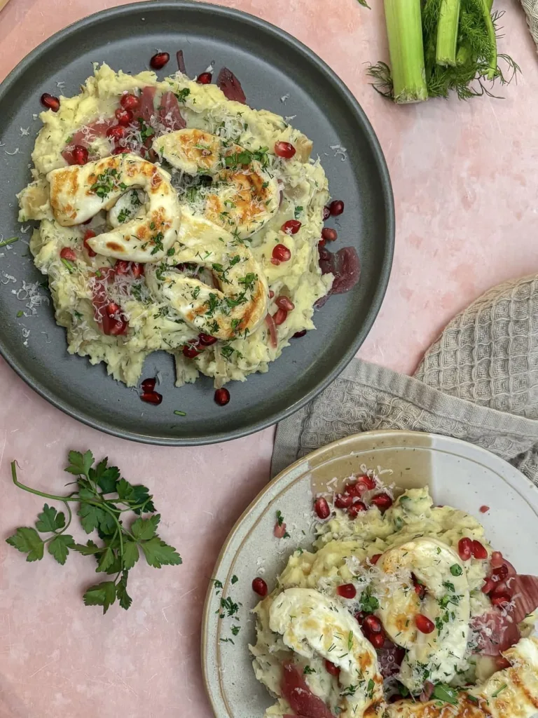 - Serveer de stamppot met de gebakken halloumi, granaatappelpitjes, ingemaakte rode ui en bestrooi met extra peterselie en dille.